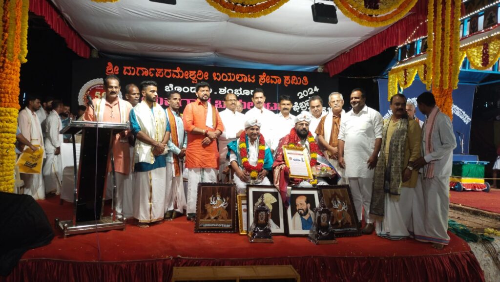 ಬಂಟ್ವಾಳ ತಾಲೂಕಿನ ಶಂಭೂರು ಗ್ರಾಮದ ಬೊಂಡಾಲದಲ್ಲಿ ಶ್ರೀ ದುರ್ಗಾಪರಮೇಶ್ವರಿ ಬಯಲಾಟ ಸೇವಾ ಸಮಿತಿ ಆಶ್ರಯದಲ್ಲಿ ಮೂರು ದಿನಗಳ ಕಾಲ ನಡೆದ ಯಕ್ಷಗಾನ ಬಯಲಾಟದ ಸುವರ್ಣ ಸಂಭ್ರಮ ಕಾರ್ಯಕ್ರಮದಲ್ಲಿ ಕಲಾವಿದ ಅಮ್ಮುಂಜೆ ಮೋಹನ ಕುಮಾರ್ ಅವರಿಗೆ ಬೊಂಡಾಲ ಪ್ರಶಸ್ತಿ, ಕಟೀಲು ಮೇಳಗಳ ಸಂಚಾಲಕ ಕಲ್ಲಾಡಿ ದೇವಿಪ್ರಸಾದ್ ಶೆಟ್ಟಿ ಮತ್ತು ಸಾಲಿಗ್ರಾಮ ಮೇಳ ಸಂಚಾಲಕ ಪಳ್ಳಿ ಕಿಶನ್ ಹೆಗ್ಡೆ ಅವರಿಗೆ ಸುವರ್ಣ ಸಂಭ್ರಮ ಸನ್ಮಾನ ಕಾರ್ಯಕ್ರಮ ನೆರವೇರಿಸಿ ಅವರು ಮಾತನಾಡಿದರು.