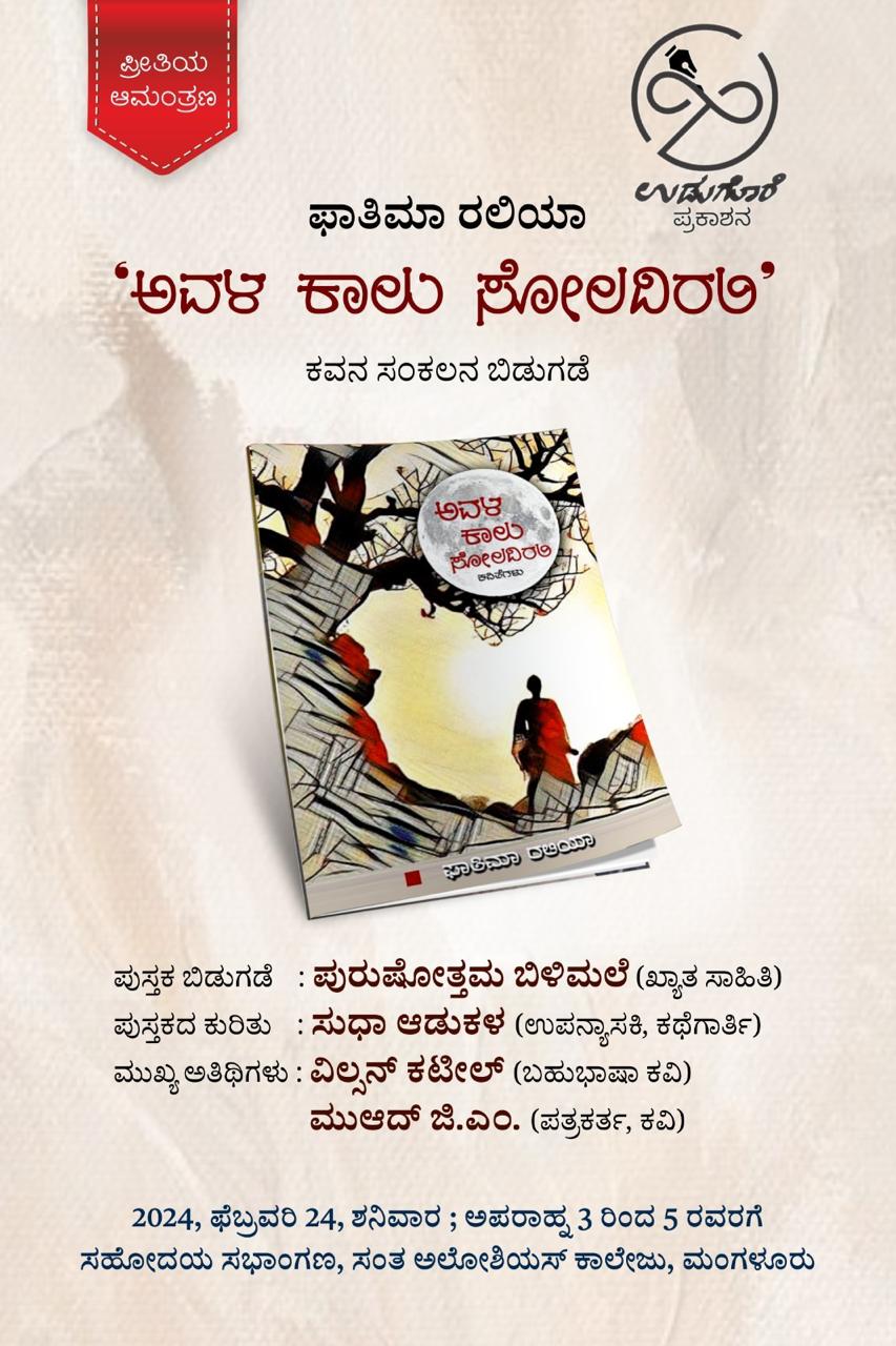 ಶನಿವಾರ 24 ರ ಸಂಜೆ ಮೂರು ಗಂಟೆಗೆ ಮಂಗಳೂರಿನ ಸಂತ ಅಲೋಶಿಯಸ್ ಕಾಲೇಜಿನ ಸಹೋದಯ ಸಭಾಂಗಣದಲ್ಲಿ ಫಾತಿಮಾ ರಲಿಯಾ ಅವರ ಕವನ ಸಂಕಲನ ‘ಅವಳ ಕಾಲು ಸೋಲದಿರಲಿ’ ಬಿಡುಗಡೆಯಾಗಲಿದೆ.