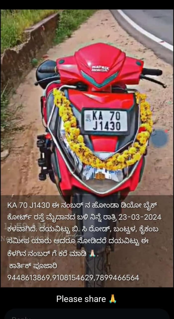 ವಾಮದಪದವು ಇರ್ವತ್ತೂರು ಮಣ್ಣೂರು ನಿವಾಸಿ ಕಾರ್ತಿಕ್ ಎಂಬವರಿಗೆ ಸೇರಿದ ಸ್ಕೂಟರ್ ಕಳವಾಗಿರುವ ಬಗ್ಗೆ ಬಂಟ್ವಾಳ ನಗರ ಪೋಲೀಸ್ ಠಾಣೆಯಲ್ಲಿ ದೂರು ದಾಖಲಾಗಿದೆ. ಕಾರ್ತಿಕ್ ಅವರು ಮಾ. 23 ರಂದು ಶನಿವಾರ ಬೆಳಿಗ್ಗೆ ವಾಮದಪದವು ಮನೆಯಿಂದ ಬಂದು ಬಿಸಿರೋಡಿನ ಹಳೆಯ ತಾಲೂಕು ಪಂಚಾಯತ್ ಕಟ್ಟಡ ಕೆಡವಿದ ಖಾಲಿ ಜಾಗದಲ್ಲಿ ಸ್ಕೂಟರ್ ನಿಲ್ಲಿಸಿ , ಬಡಕಬೈಲು ಎಂಬಲ್ಲಿ ಕೆಲಸದ ನಿಮಿತ್ತ ಹೋಗಿದ್ದರು.