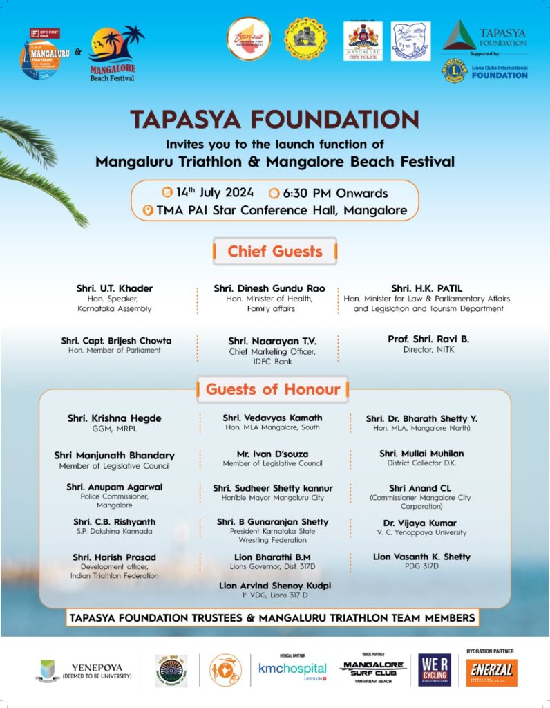ಮಂಗಳೂರು: ನಗರದ ತಪಸ್ಯ ಫೌಂಡೇಶನ್ ವತಿಯಿಂದ ಜು. 14ರಂದು ಸಂಜೆ 6.30ರಿಂದ ಟಿಎಂಎ ಪೈ ಸ್ಟಾರ್ ಕಾನ್ಫರೆನ್ಸ್ ಹಾಲ್ನಲ್ಲಿ ಮಂಗಳೂರು ತ್ರಿಯಾತ್ಲಾನ್, ಬೀಚ್ ಫೆಸ್ಟಿವಲ್ ಉದ್ಘಾಟನೆ ಕಾರ್ಯಕ್ರಮ ಜರಗಲಿದೆ.