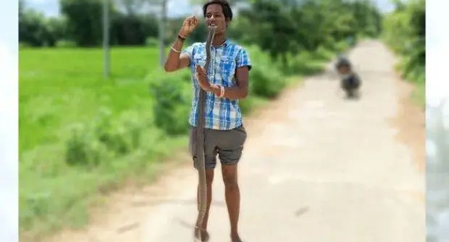 ತೆಲಂಗಾಣದ ಕಾಮರೆಡ್ಡಿ ಜಿಲ್ಲೆಯ ಬನ್ಸವಾಡ ಮಂಡಲದ ದೇಸಾಯಿಪೇಟ್ ಗ್ರಾಮದ ಹಾವಾಡಿಗನೊಬ್ಬನ ಮಗ ಶಿವ ಎಂಬಾತ ಗ್ರಾಮದ ಕಾಲೋನಿಗೆ ಪ್ರವೇಶಿಸಿದ 6 ಅಡಿಯ ನಾಗರ ಹಾವನ್ನು ಹಿಡಿದು ಗ್ರಾಮದಿಂದ ಹೊರಗೆ ಬಿಡಲು ತೆಗೆದುಕೊಂಡು ಹೋಗುವ ವೇಳೆ ಹುಚ್ಚು ಸಾಹಸವನ್ನು ಮಾಡಿದ್ದಾನೆ.