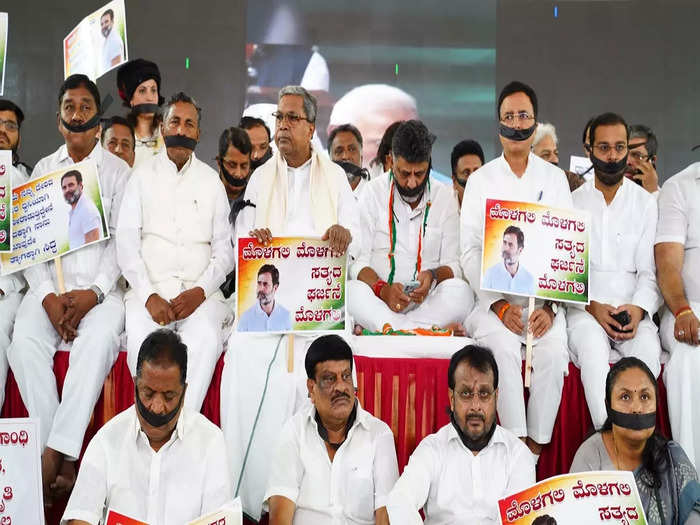 ಕಾಂಗ್ರೆಸ್ ನಾಯಕ ರಾಹುಲ್ ಗಾಂಧಿ ಅವರ ಸಂಸತ್ ಸದಸ್ಯತ್ವ ಅನರ್ಹ ಮಾಡುವ ಮೂಲಕ ಕೇಂದ್ರದ ಬಿಜೆಪಿ ಸರಕಾರ ದ್ವೇಷ ರಾಜಕಾರಣ ಮಾಡುತ್ತಿದೆ ಎಂದು ಆಪಾದಿಸಿ ಇಂದು ಕೆಪಿಸಿಸಿ ಮೌನ ಪ್ರತಿಭಟನೆಗೆ ಕರೆ ನೀಡಿದ್ದ ಹಿನ್ನೆಲೆಯಲ್ಲಿ ಬೆಂಗಳೂರಿನ ಫ್ರೀಡಂ ಪಾರ್ಕ್ ನಲ್ಲಿ ಹಲವು ಪ್ರಮುಖರು ಬಾಯಿಗೆ ಬಟ್ಟೆ ಕಟ್ಟಿ ಪ್ರತಿಭಟಿಸಿದರು. ವಿವಿಧ ಘೋಷಣೆಗಳುಳ್ಳ ಭಿತ್ತಿಚಿತ್ರಗಳನ್ನು ಪ್ರತಿಭಟನಕಾರರು ಪ್ರದರ್ಶಿಸಿದರು.