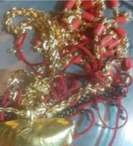 ಅಂದಾಜು 3.20 ಲಕ್ಷ ರೂ. ಮೌಲ್ಯದ 40 ಗ್ರಾಂ ತೂಕದ ಚಿನ್ನದ ಜೋಬಿನ ಸರ, 5.84 ಲಕ್ಷ ರೂ. ಮೌಲ್ಯದ 73 ಗ್ರಾಂ ತೂಕದ ಹವಳ ಸೇರಿದ ಚಿನ್ನದ ಕಾಸಿ ತಾಳಿ ಸರ, 5.84 ಲಕ್ಷ ರೂ. ಮೌಲ್ಯದ 73 ಗ್ರಾಂ ತೂಕದ ಚಿನ್ನದ ಕರಿಮಣಿ ಸರ, 5.12 ಲಕ್ಷ ರೂ. ಮೌಲ್ಯದ 64 ಗ್ರಾಂ ತೂಕದ ಚಿನ್ನದ ನಕ್ಷೆಸ್, 48 ಸಾವಿರದ 6 ಗ್ರಾಂ ತೂಕದ 3 ಚಿನ್ನದ ತಾಳಿ, 64 ಸಾವಿರದ 8 ಗ್ರಾಂ ತೂಕದ ಚಿನ್ನದ ಚೈನ್ ಸರ ಸಹಿತ ಒಟ್ಟು ರೂ 21.12 ಲಕ್ಷ ರೂ. ಮೌಲ್ಯದ 264 ಗ್ರಾಮ್ ತೂಕದ ಚಿನ್ನಾಭರಣಗಳನ್ನು ದೇವರ ಮೂರ್ತಿಯ ಮೇಲಿನಿಂದ ತೆಗೆದು ಕಳವುಗೈದಿದ್ದಾನೆ.