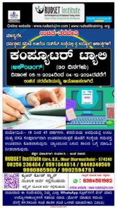 ರುಡ್ ಸೆಟ್ ಸಂಸ್ಥೆ, ಉಜಿರೆ, ದಕ್ಷಿಣ ಕನ್ನಡ ಜಿಲ್ಲೆ ಇಲ್ಲಿ ಕಂಪ್ಯೂಟರ್ ಟ್ಯಾಲಿ (Computer Tally) ತರಬೇತಿಯನ್ನು ಆಯೋಜಿಸಿದ್ದು, ದಿನಾಂಕ 05.11.24 ರಿಂದ 04.12.24ರ ವರೆಗೆ (30ದಿನ) ಪ್ರತಿ ದಿನ ಬೆಳಿಗ್ಗೆ 9.30ರಿಂದ ಸಾಯಂಕಾಲ 6.00ರವರೆಗೆ ತರಬೇತಿ ನಡೆಯುತ್ತದೆ.
