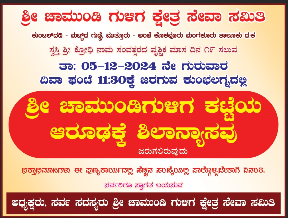 ಶ್ರೀ ಚಾಮುಂಡಿ ಗುಳಿಗ ಕ್ಷೇತ್ರ ಸೇವಾ ಸಮಿತಿ ಕುಂಟಲ್ ದಡಿ ಮಟ್ಟ್ ದ ಗುಡ್ಡೆ ಮುತ್ತೂರು ಇಲ್ಲಿನ ಚಾಮುಂಡಿ ಆರೂಢ ಗುಳಿಗ ದೈವದ ಕಟ್ಟೆಗೆ ಶಿಲಾನ್ಯಾಸ ಕಾರ್ಯಕ್ರಮವು ಐ ಕೃಷ್ಣ ಆಸ್ರಣ್ಣ ಇವರ ನೇತೃತ್ವದಲ್ಲಿ ನೆರವೇರಿತು .
