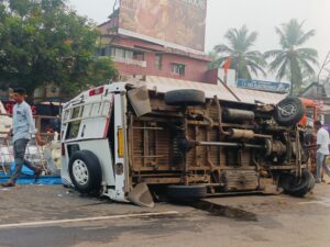 ಬಂಟ್ವಾಳ: ಚಾಲಕನ ನಿಯಂತ್ರಣ ತಪ್ಪಿ ಟೆಂಪೋ ಟ್ರಾವೆಲ್ ವಾಹನವೊಂದು ರಾಷ್ಟ್ರೀಯ ಹೆದ್ದಾರಿ ಮಂಗಳೂರು ಬೆಂಗಳೂರು ಹೆದ್ದಾರಿಯ ಫರಂಗಿಪೇಟೆ ಎಂಬಲ್ಲಿ ಪಲ್ಟಿಯಾಗಿದೆ.
