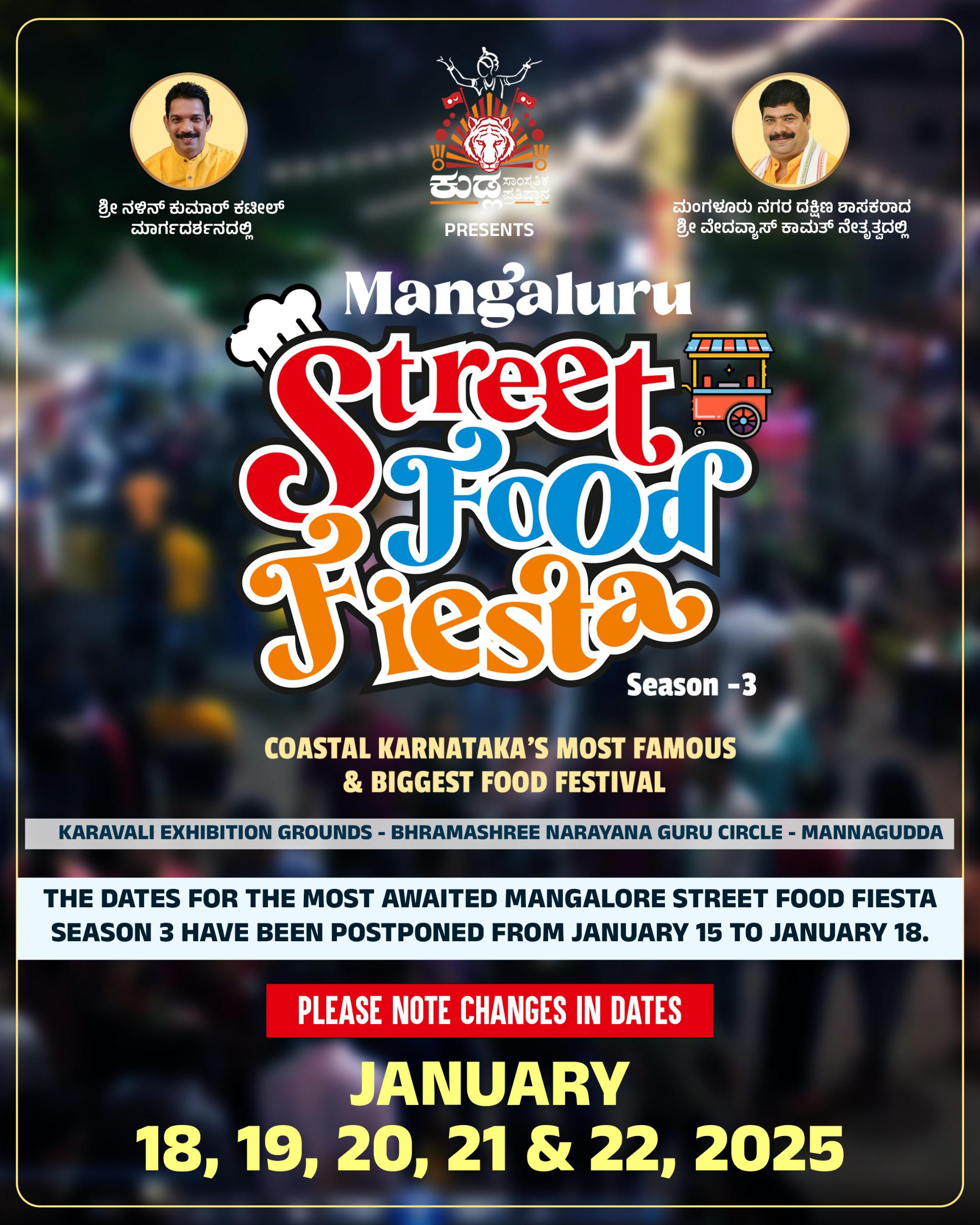 ಶ್ರೀ ನಳಿನ್ ಕುಮಾರ್ ಕಟೀಲ್ ಮಾರ್ಗದರ್ಶನ ಹಾಗೂ ಮಂಗಳೂರು ನಗರ ದಕ್ಷಿಣ ಶಾಸಕರಾದ ಶ್ರೀ ಡಿ.ವೇದವ್ಯಾಸ ಕಾಮತ್ ರವರ ನೇತೃತ್ವದ ಕುಡ್ಲ ಸಾಂಸ್ಕೃತಿಕ ಪ್ರತಿಷ್ಠಾನ ಹಾಗೂ ಜಿಲ್ಲಾಡಳಿತದ ಸಹಕಾರದೊಂದಿಗೆ ಬಹು ನಿರೀಕ್ಷಿತ ಮಂಗಳೂರು ಸ್ಟ್ರೀಟ್ ಫುಡ್ ಫಿಯೆಸ್ಟ ಸೀಸನ್-3 ಇದೇ 2025ರ ಜನವರಿ 18 ರಿಂದ 22 ರ ವರೆಗೆ ಐದು ದಿನಗಳ ಕಾಲ ನಡೆಯಲಿದೆ. ಜನವರಿ 18ರ ಸಂಜೆ ಜಿಲ್ಲೆಯ ಹಲವು ಗಣ್ಯ ಅತಿಥಿಗಳಿಂದ ಸೀಸನ್-3ಗೆ ಅಧಿಕೃತ ಚಾಲನೆ ದೊರೆಯಲಿದ್ದು ಕರಾವಳಿ ಉತ್ಸವ ಮೈದಾನದಿಂದ ನಾರಾಯಣ ಗುರು ವೃತ್ತ, ಮಣ್ಣಗುಡ್ಡ ಗುರ್ಜಿ ವೃತ್ತ, ಕೆನರಾ ಉರ್ವ” ದವರೆಗೆ ಪ್ರತಿ ನಿತ್ಯ ಸಂಜೆ 4ರಿಂದ ರಾತ್ರಿ 10 ರವರೆಗೆ ಈ “ಆಹಾರೋತ್ಸವ” ನಡೆಯಲಿದೆ.