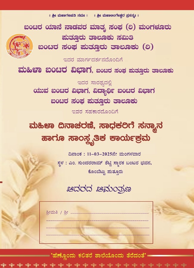ಮಹಿಳಾ ದಿನಚರಣೆ, ಸಾಧಕರಿಗೆ ಸನ್ಮಾನ ಹಾಗೂ ಸಾಂಸ್ಕೃತಿಕ ಕಾರ್ಯಕ್ರಮ;ಎಂ.ಸುOದರರಾಮ್ ಶೆಟ್ಟಿ ಸ್ಮಾರಕ ಬಂಟರ ಭವನ ಕೊಂಬೆಟ್ಟುನಲ್ಲಿ ಆಯೋಜನೆ