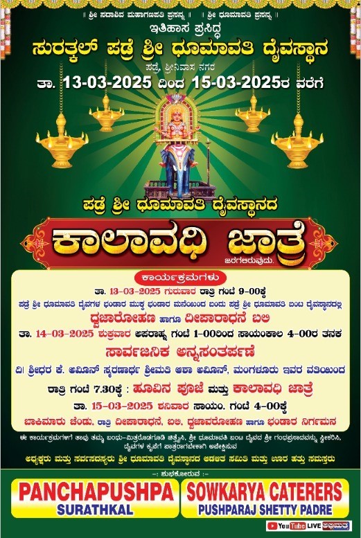 ಸುರತ್ಕಲ್ ಪಡ್ರೆ ಶ್ರೀ ಧೂಮಾವತಿ ದೈವಸ್ಥಾನದಲ್ಲಿ ಮಾ.13ರಿಂದ 15ರವರೆಗೆ ಕಾಲಾವಧಿ ಜಾತ್ರೋತ್ಸವ ನಡೆಯಲಿದೆ.