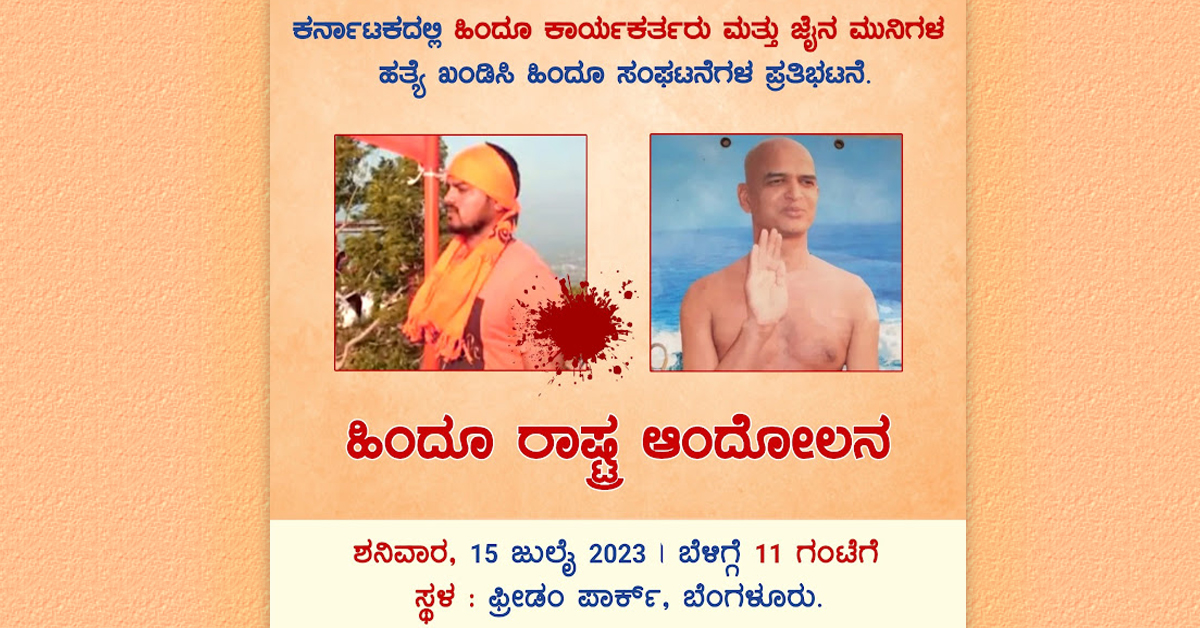 ಬೆಳ್ತಂಗಡಿ: ಜೈನ ಮುನಿಗಳ ಹತ್ಯೆ ಖಂಡಿಸಿ ಕರ್ನಾಟಕದಲ್ಲಿ ಹಿಂದೂ ಕಾರ್ಯಕರ್ತರು ಮತ್ತು ಹಿಂದೂ ಸಂಘಟನಗಳ ಹಿಂದೂ ರಾಷ್ಟ್ರ ಆಂದೋಲನವು ಜುಲೈ 19 ರಂದು ಬೆಳ್ತಂಗಡಿ ಮಿನಿ ವಿಧಾನ ಸೌಧದ ಮುಂಭಾಗ ಜರುಗಲಿದೆ. ದೇಶದಾದ್ಯಂತ ವಕ್ಫ್ ಬೋರ್ಡ್ ಕಾಯ್ದೆ ರದ್ದುಗೊಳಿಸಲು ಹಿಂದೂ ರಾಷ್ಟ್ರ ಜಾಗೃತಿ ಆಂದೋಲನದಲ್ಲಿ ಬೇಡಿಕೆ ಹಾಗೂ ಕರ್ನಾಟಕದಲ್ಲಿ ಹಿಂದೂಗಳ ಹತ್ಯೆ ಖಂಡಿಸಿ ಹಿಂದೂಗಳ ರಕ್ಷಣೆಗೆ ಆಗ್ರಹ ನೀಡಲಿದೆ. ರಾಜ್ಯದಲ್ಲಿ ಸಿದ್ದರಾಮಯ್ಯ ನೇತೃತ್ವದ ಕಾಂಗ್ರೆಸ್ ಸರಕಾರ ಅಧಿಕಾರಕ್ಕೆ ಬಂದಿರುವ ಹಿನ್ನೆಲೆಯಲ್ಲಿ ಹಿಂದೂ ಸಂತರು, ಹಿಂದೂ ಸಂಘಟನೆಗಳ ಕಾರ್ಯಕರ್ತರು, ಮುಖಂಡರ ಮೇಲೆ ದೌರ್ಜನ್ಯಗಳು ಮರುಕಳಿಸುತ್ತಿವ ಎಂದು ಹಿಂದೂ ಸಂಘಟನೆಗಳು ಆರೋಪಿಸಿವೆ.