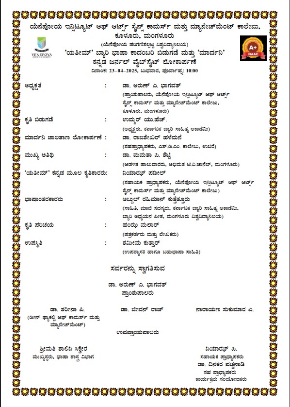 ಮಂಗಳೂರು ನಗರದ ಕೂಳೂರಿನಲ್ಲಿರುವ ಯೆನೆಪೋಯ ಇನ್ಸಿಟ್ಯೂಟ್ ಆಫ್ ಆರ್ಟ್ಸ್ ಸೈನ್ಸ್ ಕಾಮರ್ಸ್ ಮತ್ತು ಮನೆಜ್ಮೆಂಟ್ ಕಾಲೇಜಿನಲ್ಲಿ ಯತೀಮ್ ಬ್ಯಾರಿ ಭಾಷಾ ಕಾದಂಬರಿ ಬಿಡುಗಡೆ ಮತ್ತು ಮಾರ್ದನಿ ಕನ್ನಡ ಜರ್ನಲ್ ವೆಬ್ಸೈಟ್ ಲೋಕಾರ್ಪಣೆ ಕಾರ್ಯಕ್ರಮವು ಬುಧವಾರ ಬೆಳಗ್ಗೆ 10 ಗಂಟೆಗೆ ನಡೆಯಲಿದೆ.