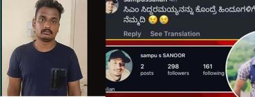 ಬೆಂಗಳೂರಿನ ಹೋಂ ಗಾರ್ಡ್ ಕಚೇರಿಯಲ್ಲಿ ಕೆಲಸ ಮಾಡುತ್ತಿದ್ದ ಸಂಪತ್ ಸಾಲಿಯಾನ್ ‘ಸಿಎಂ ಸಿದ್ದರಾಮಯ್ಯನನ್ನು ಕೊಂದ್ರೆ ಹಿಂದೂಗಳಿಗೆ ನೆಮ್ಮದಿ’ ಎಂದು ಬರೆದು ಸಾಮಾಜಿಕ ಜಾಲತಾಣದಲ್ಲಿ ಪೋಸ್ಟ್ ಮಾಡಿದ್ದಾನೆ. ಈ ಸಂಬಂಧ ಸದ್ಯ ಕಾರ್ಕಳ ಪೊಲೀಸರು ಹೋಂ ಗಾರ್ಡ್ ಸಂಪತ್ನನ್ನು ಬಂಧಿಸಿದ್ದಾರೆ.