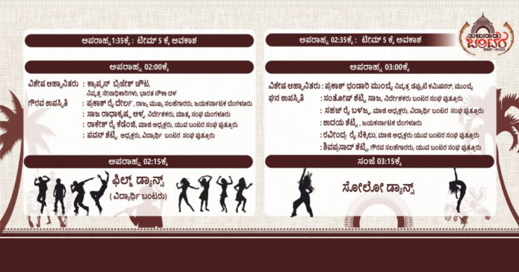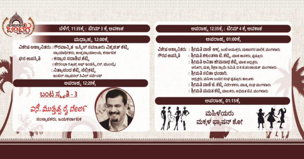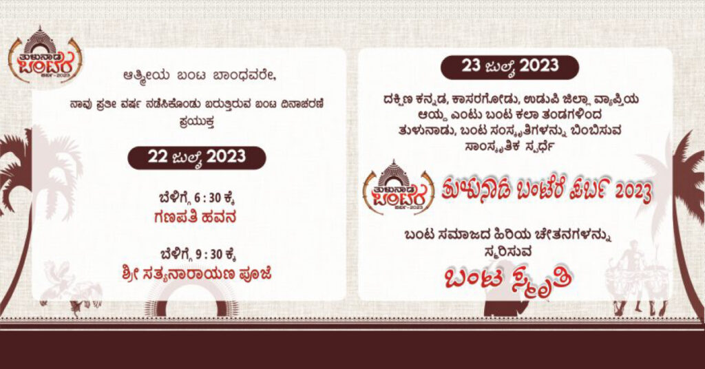 ಕಳೆದ 10 ವರ್ಷಗಳಿಂದ ಬಂಟ ದಿನಾಚರಣೆ ಕಾರ್ಯಕ್ರಮ ನಡೆಸುತ್ತಾ ಬಂದಿದ್ದೇವೆ. ಬೆಳಿಗ್ಗೆ ಗಣಹೋಮ ಸತ್ಯನಾರಾಯಣ ಪೂಜೆ, ನಂತರ ಸಾಂಸ್ಕೃತಿಕ ಕಾರ್ಯಕ್ರಮ, ಸಭೆ. ಮಧ್ಯಾಹ್ನ ಮುಗೀತಿತ್ತು. ಈ ಬಾರಿ ಸ್ವಲ್ಪ ಬದಲಾವಣೆ ಮಾಡಿದ್ದೇವೆ ಜುಲೈ 22 ಶನಿವಾರ ಬೆಳಿಗ್ಗೆ ಗಣಹೋಮ ಮತ್ತು ಸತ್ಯನಾರಾಯಣ ಪೂಜೆ ನಡೀತದೆ. ಜುಲೈ 23 ರಂದು ಬೆಳಿಗ್ಗೆ 9 ರಿಂದ ಸಂಜೆ 5 ರವರೆಗೆ ಸಂಪೂರ್ಣ ಮನರಂಜನಾ ಕಾರ್ಯಕ್ರಮ ನಡೀತದೆ.