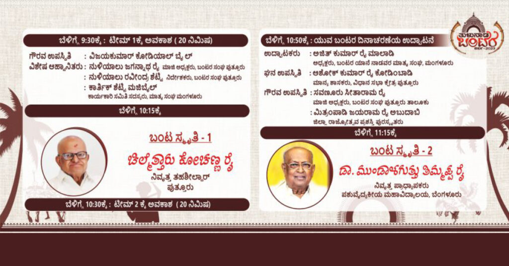 ಕಾರ್ಯಕ್ರಮನ್ನು ಬಂಟರ ಯಾನೆ ನಾಡವರ ಮಾತೃ ಸಂಘದ ಅಧ್ಯಕ್ಷರು ಅಜಿತ್ ರೈ ಮಾಲಾಡಿ ಉದ್ಘಾಟಿಸಲಿದ್ದಾರೆ. ಪುತ್ತೂರಿನ ಜನಪ್ರಿಯ ಶಾಸಕರು ಅಶೋಕ್ ಕುಮಾರ್ ರೈ, ಮುಂಬಯಿ ಹೇರಂಭಾ ಗ್ರೂಪ್ ನ ಆಡಳಿತ ನಿರ್ದೇಶಕ ಕನ್ಯಾನ ಸದಾಶಿವ ಶೆಟ್ಟಿ, ಇಂಟರ್ ನ್ಯಾಶನಲ್ ಸಿವಿಲ್ ಸರ್ವೆಂಟ್ ನಿತ್ಯಾನಂದ ಶೆಟ್ಟಿ, ಮುಂಬಯಿ ನಿವೃತ್ತ ಡೆಪ್ಯುಟಿ ಕಮೀಷನರ್ ಶಾರ್ಪ್ ಶೂಟರ್ ಖ್ಯಾತಿಯ ಪ್ರಕಾಶ್ ಭಂಡಾರಿ, ಕ್ಯಾಪ್ಟನ್ ಬ್ರಿಜೇಶ್ ಚೌಟ, ಮಂಗಳೂರು ಮಹಾನಗರ ಪಾಲಿಕೆಯ ಜಂಟೀ ಆಯುಕ್ತರು ವಾಣಿ ಎಸ್ ಆಳ್ವ, ಗುಣರಂಜನ್ ಶೆಟ್ಟಿ, ಪ್ರಕಾಶ್ ರೈ ದೇರ್ಲ, ಮಾಜಿ ಶಾಸಕಿ ಶಕುಂತಲಾ ಶೆಟ್ಟಿ, ಮಲ್ಲಿಕಾ ಪ್ರಸಾದ್ ಸಮಾರೋಪ ಸಮಾರಂಭದಲ್ಲಿ ಬಂಟರ ಯಾನೆ ನಾಡವರ ಮಾತೃ ಸಂಘದ ಉಪಾಧ್ಯಕ್ಷರು ಕಾವು ಹೇಮನಾಥ್ ಶೆಟ್ಟಿಯವರು ಮತ್ತು ಹೀಗೆ ಗಣ್ಯಾತಿ ಗಣ್ಯರು ನಮ್ಮೊಂದಿಗೆ ಕಾರ್ಯಕ್ರಮದಲ್ಲಿ ಜೊತೆಯಾಗಲಿದ್ದಾರೆ.