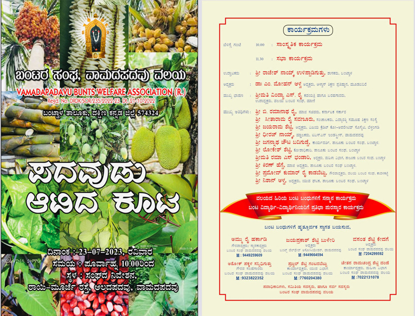 ಬಂಟರ ಸಂಘ, ವಾಮದ ಪದವು ವಲಯದ ವತಿಯಿಂದ ‘ಪದವುಡು ಆಟಿದ ಕೂಟ’ ಎಂಬ ಅದ್ದೂರಿ ಕಾರ್ಯಕ್ರಮ ಇದೇ 23-07-2023ರ ರವಿವಾರ ನಡೆಯಲಿದೆ. ವಾಮದಪದವಿನ ಆಲದಪದವಿನ ರಾಯಿ-ಮೂರ್ಜೆ ರಸ್ತೆ ಬಳಿಯ ಸಂಘದ ನಿವೇಶನದಲ್ಲಿ ಈ ಕಾರ್ಯಕ್ರಮ ಹಮ್ಮಿಕೊಳ್ಳಲಾಗಿದೆ. ಬಂಟ್ವಾಳ ಶಾಸಕ ರಾಜೇಶ್ ನಾಯ್ಕ್ ಉಳಿಪ್ಪಾಡಿಗುತ್ತು ಕಾರ್ಯಕ್ರಮ ಉದ್ಘಾಟಿಸಲಿದ್ದಾರೆ. ಮೂಡುಬಿದಿರೆ ಆಳ್ವಾಸ್ ಶಿಕ್ಷಣ ಸಂಸ್ಥೆಯ ಡಾ. ಎಂ. ಮೋಹನ್ ಆಳ್ವಾ ಅಧ್ಯಕ್ಷತೆ ವಹಿಸಲಿದ್ದಾರೆ. ಮಾಣಿ ವಲಯ ಬಂಟರ ಸಂಘದ ಉಪಾಧ್ಯಕ್ಷರು, ಕವಯತ್ರಿ ಹಾಗೂ ಬರಹಗಾರ್ತಿ ವಿಂದ್ಯಾ ಎಸ್. ರೈಯವರು ಮುಖ್ಯ ಭಾಷಣಕಾರರಾಗಿ ಉಪನ್ಯಾಸ ನೀಡಲಿದ್ದಾರೆ.
