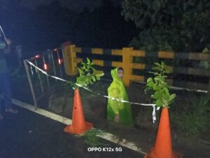ಅತಿಯಾದ ಮತ್ತು ನಿರಂತರವಾಗಿ ಸುರಿಯುವ ಮಳೆಯ ನೀರು ಹರಿದುಹೋಗಲು ಸಾಧ್ಯವಾಗದೆ ಸಿಕ್ಕಸಿಕ್ಕ ಕಡೆಗಳಲ್ಲಿ ಹರಿದುಹೋಗುತ್ತಿದೆ. ಇಲ್ಲೂ ಕೂಡ ಜನರು ನಡೆದುಕೊಂಡು ಹೋಗುವ ಸೇತುವೆಯ ಒಂದು ಭಾಗದಲ್ಲಿ ಹೊಂಡನಿರ್ಮಾಣವಾಗಿ ಅದರೊಳಗೆ ನೀರು ಬೀಳುತ್ತಿದೆ. ಇದು ಅಪಾಯಕಾರಿಯಾಗಿದ್ದು, ಪಾದಾಚಾರಿಗಳು ಅದರ ಮೇಲೆ ಹೋದರೆ ಹೊಂಡದೊಳಗೆ ಬೀಳುವ ಸಾಧ್ಯತೆಗಳಿವೆ. ಹಾಗಾಗಿ ಇಲ್ಲಿ ಯಾರು ಹೋಗದಂತೆ ಎಚ್ಚರಿಕೆ ನೀಡಲಾಗಿದೆ. ಆದರೆ ವಾಹನ ಸಂಚಾರಕ್ಕೆ ಯಾವುದೇ ತೊಂದರೆ ಇಲ್ಲ.