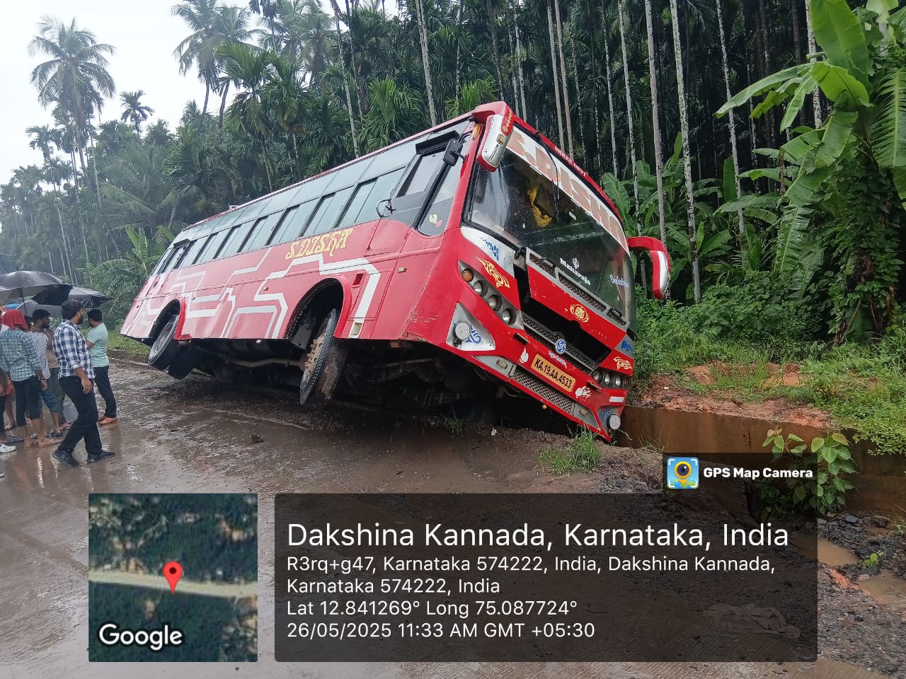 ಪುತ್ತೂರಿನಿಂದ ಮಂಗಳೂರಿಗೆ ತೆರಳುತ್ತಿದ್ದ ಬಸ್ಸು ಕುದ್ರೆಬೆಟ್ಟು ತಲುಪುತ್ತಿದ್ದಂತೆ ಕಾಂಕ್ರೀಟ್ ಚರಂಡಿಗೆ ಬಿದ್ದಿದ್ದು, ಮನೆಯಿಂದ ಬ್ರೇಕ್ ಸಿಗದೆ ಚಾಲಕನ ನಿಯಂತ್ರಣ ಕಳೆದುಕೊಂಡಿರುವ ಸಾಧ್ಯತೆ ಇದೆ ಎನ್ನಲಾಗಿದೆ. ಘಟನೆಯಲ್ಲಿ ಬಸ್ಸಿಗೆ ಹಾನಿಯಾಗಿದ್ದು, ಪ್ರಯಾಣಿಕರಿಗೆ ಹೆಚ್ಚಿನ ತೊಂದರೆಯಾಗಿಲ್ಲ ಎನ್ನಲಾಗಿದೆ.