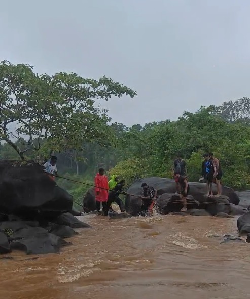 ಮಳೆ ಶುರುವಾಯಿತೆಂದರೆ ಕರಾವಳಿಯಲ್ಲಿ ಜಲಪಾತಗಳು ಮೈದೋರುತ್ತವೆ. ಇವು ದೂರದಿಂದ ನೋಡಲು ರೋಚಕ ಮತ್ತು ಸುಂದರ. ದ.ಕ ಜಿಲ್ಲಾದ್ಯಂತ ಭಾರೀ ಮಳೆಯಾಗುತ್ತಿರುವ ಹಿನ್ನೆಲೆ ಯಲ್ಲಿ ಜಲಪಾತಗಳಿಗೆ ಬರುವವರ ಸಂಖ್ಯೆ ಹೆಚ್ಚಾಗಿದೆ. ಹೀಗೆ ಬಂದವರು ಜಲಪಾತದೆದುರು ತಮ್ಮ ಕೌಶಲ್ಯ ಪ್ರದರ್ಶನಕ್ಕೆ ಮುಂದಾಗಿ ಅಪಾಯಕ್ಕೆ ಸಿಲುಕುತ್ತಾರೆ. ಇಂತಹ ಘಟನೆ ಮೂಡಬಿದ್ರೆ ಸಮೀಪದ ಎರುಗುಂಡಿ ಜಲಪಾತದ ಸಮೀಪ ನಡೆದಿದೆ. ಸ್ಥಳೀಯರು ಹಗ್ಗ ಬಳಸಿ ಜಲಪಾತದ ನಡುವೆ ಸಿಲುಕಿದ್ದವರನ್ನು ರಕ್ಷಿಸಿದ್ದಾರೆ.