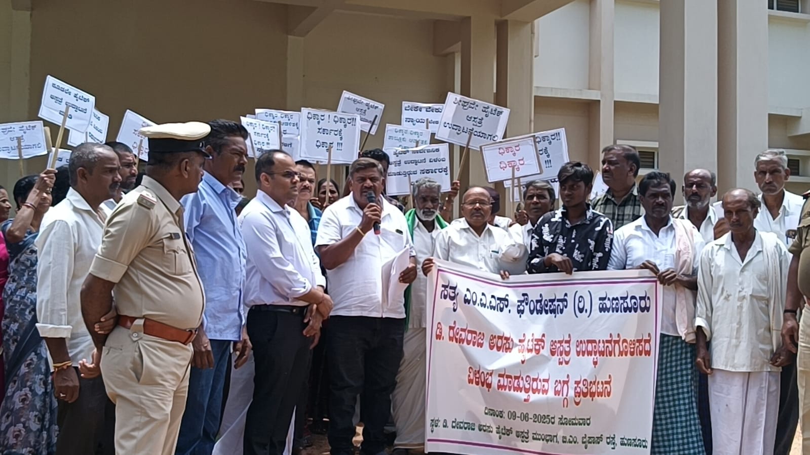 ಗೋವಿಂದನಳ್ಳಿ ಗ್ರಾಮ ಪಂಚಾಯಿತಿ ವ್ಯಾಪ್ತಿಗೆ ಬರುವ ವಿನಾಯಕನಗರ ಬಡಾವಣೆಯಲ್ಲಿ ಸೈನಿಕರು ವನ್ಯಜೀವಿ ವೈದ್ಯಾಧಿಕಾರಿಗಳು ವಾಸವಾಗಿದ್ದು ಪಂಚಾಯಿತಿಯಿ0ದ ಕುಡಿಯುವ ನೀರು ಸೌಲಭ್ಯವನ್ನು ಕಲ್ಪಿಸಿ ಕೊಟ್ಟಿಲ್ಲ. ಕೂಡಲೇ ಕಲ್ಪಿಸಿಕೊಡಬೇಕು ಎಂದರು. ಮನವಿ ಸ್ವೀಕರಿಸಿದ ಉಪವಿಭಾಗಾಧಿಕಾರಿಗಳಾದ ವಿಜಯ್ ಕುಮಾರ್ ರವರು ಮಾತನಾಡಿ ಸತ್ಯಪ್ಪ ರವರು ಹಲವು ಬೇಡಿಕೆಗಳ ಈಡೇರಿಕೆಗಾಗಿ ಮನವಿ ಸಲ್ಲಿಸಿದ್ದು, ಜಿಲ್ಲಾಧಿಕಾರಿಗಳು ಹುಣಸೂರಿಗೆ ಬರುತ್ತಿದ್ದು ಅವರ ಗಮನಕ್ಕೆ ತಂದು ತುರ್ತಾಗಿ ಬಗೆಹರಿಸಲು ಕ್ರಮ ಕೈಗೊಳ್ಳಲಾಗುವುದು ಎಂದರು. ಉಪವಿಭಾಗಾಧಿಕಾರಿಗಳ ಕಛೇರಿಯ ಯದುಗಿರೀಶ್ ರವರು ಸಹ ಉಪಸ್ಥಿತರಿದ್ದರು. ಈ ಸಂದರ್ಭದಲ್ಲಿ ನಿವೃತ್ತಿ ಸಿ.ಟಿ. ಆರ್ ಐ ತಾಂತ್ರಿಕ ಅಧಿಕಾರಿ ಎಂ. ಶಂಭುಗೌಡ, ರೈತ ಮುಖಂಡರಾದ ಎಂ. ಕೃಷ್ಣೇಗೌಡ, ಬಸಪ್ಪ ಹಂದನಹಳ್ಳಿ, ಪುರುಸೋತ್ತಮರಾವ್ ಸಾಳುಂಕೆ, ತಾಲ್ಲೂಕು ಮಡಿವಾಳ ಸಂಘದ ಪ್ರಧಾನ ಕಾರ್ಯದರ್ಶಿಗಳಾದ ನಾಗಪ್ಪಶೆಟ್ಟಿ, ಗೊಂದಳಿ ಸಮಾಜದ ಅಧ್ಯಕ್ಷರಾದ ಆನಂದ, ರಾಕೇಶ್ ರಾವ್, ಗ್ರಾಮ ಪಂಚಾಯ್ತಿ ಸದಸ್ಯರಾದ ಕುಮಾರ್, ಶಿವಶೇಖರ, ಚಂದ್ರೇಗೌಡ, ಸ್ಟಾಲಿನ್, ದೇವರಾಜೇಗೌಡ, ಹೇಮಚಂದ್ರೇಗೌಡ, ಸೋಮಶೇಖರ, ಚಿಕ್ಕನಂಜಯ್ಯ, ಪ್ರಕಾಶ್, ವಿಜಯಲಕ್ಷ್ಮಿ, ಪವಿತ್ರಾ, ಶೋಭಾ, ಸವಿತಾ, ಲಕ್ಷ್ಮಮ್ಮ, ರುದ್ರಮ್ಮ ಮುಂತಾದ ನೂರಾರು ಮಂದಿ ಹಾಜರಿದ್ದರು.
