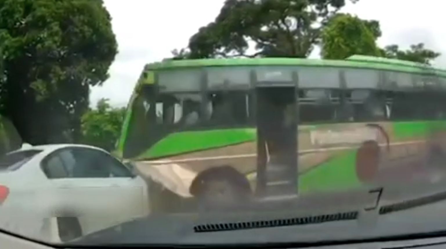ವೇಗವಾಗಿ ಬಂದ ಖಾಸಗಿ ಬಸ್ಸೊಂದು ಬಿಎಂಡಬ್ಲ್ಯೂ ಕಾರಿಗೆ ಗುದ್ದಿದೆ. ಗುದ್ದಿದ ರಭಸಕ್ಕೆ ಕಾರು ಸಂಪೂರ್ಣ ನಜ್ಜುಗುಜ್ಜಾಗಿದೆ .ಅದೃಷ್ಟವಶಾತ್ ಅಪಘಾತದಲ್ಲಿ ಕಾರಿನಲ್ಲಿದ್ದವರು ಪಾರಾಗಿದ್ದಾರೆ ಎನ್ನಲಾಗಿದೆ. ಪಕ್ಕದ ಕಾರಿನಲ್ಲಿದ್ದ ಕ್ಯಾಮೆರಾದಲ್ಲಿ ಈ ದೃಶ್ಯ ಸರೆಯಾಗಿದ್ದು ವೈರಲ್ ಆಗುತ್ತಿದೆ.