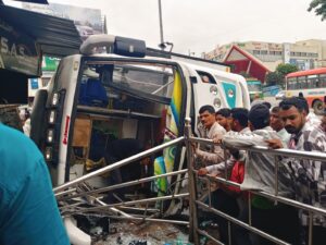 ಶಿವಮೊಗ್ಗದ ಅಮೀರ್ ಅಹಮದ್ ಸರ್ಕಲ್ನಲ್ಲಿ ಈ ಘಟನೆ ಸಂಭವಿಸಿದೆ. ಅದೃಷ್ಟವಶಾತ್ ಯಾರಿಗೂ ಹಾನಿಯಾಗಿಲ್ಲ. ಎಎ ವೃತ್ತದ ಬಳಿ ಬಸ್ ಬಂದಾಗ ಆಟೋವೊಂದು ಅಡ್ಡ ಬಂದಿದೆ. ಈ ಸಂದರ್ಭ ಚಾಲಕನ ನಿಯಂತ್ರಣ ತಪ್ಪಿದ ಮಿನಿ ಬಸ್ ಪಲ್ಟಿಯಾಗಿದೆ ಎಂದು ಪೊಲೀಸರು ತಿಳಿಸಿದ್ದಾರೆ. ಬಸ್ಸಿನಲ್ಲಿ ಪ್ರಯಾಣಿಕರಾರೂ ಇರಲಿಲ್ಲ. ಚಾಲಕ ಒಬ್ಬರೆ ಇದ್ರು. ಪಶ್ಚಿಮ ಸಂಚಾರ ಠಾಣೆ ವ್ಯಾಪ್ತಿಯಲ್ಲಿ ಘಟನೆ ಸಂಭವಿಸಿದೆ.