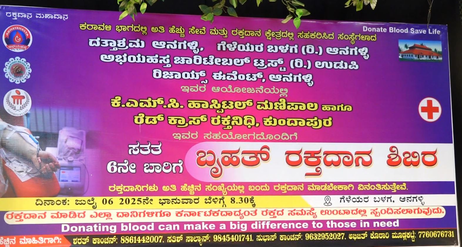 6ನೇ ವಾರ್ಷಿಕ ಬೃಹತ್ ರಕ್ತದಾನ ಶಿಬಿರ ಕಾರ್ಯಕ್ರಮ ಕುಂದಾಪುರ ಆನಗಳ್ಳಿಯ ಗೆಳೆಯರ ಬಳಗ ಸಭಾಂಗಣದಲ್ಲಿ ನಡೆಯಿತು. ದತ್ತಾಶ್ರಮ ಆಧಿಶಕ್ತಿ ಮಠ, ಚಾರಿಟೇಬಲ್ ಟ್ರಸ್ಟ್ ಆನಗಳ್ಳಿ, ಗೆಳೆಯರ ಬಳಗ(ರಿ) ಆನಗಳ್ಳಿ, ಉಡುಪಿ ಅಭಯಹಸ್ತ ಚಾರಿಟೇಬಲ್ ಟ್ರಸ್ಟ್, ರಿಜಾಯ್ಸ್ ಈವೆಂಟ್, ಮಣಿಪಾಲ ಕೆಎಂಸಿ ಹಾಸ್ಪಿಟಲ್, ಭಾರತೀಯ ರೆಡ್ ಕ್ರಾಸ್ ರಕ್ತನಿಧಿ ಸಹಯೋಗದೊಂದಿಗೆ ಶಿಬಿರ ನಡೆದಿದೆ.