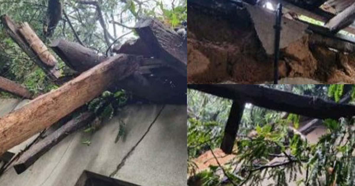 ವಿಪರೀತ ಗಾಳಿಯ ಕಾರಣದಿಂದಲಾಗಿ ಏಕಾಏಕಿ ಮನೆಯ ಮೇಲೆ ಮರ ಬಿದ್ದಿದೆ ಎಂದು ತಿಳಿದು ಬಂದಿದೆ. ಸುಧಾಕರ್ ಎಂಬವರ ಮನೆ ಇದಾಗಿದ್ದು, ಮನೆಯಲ್ಲಿದ್ದ ನಾಲ್ವರು ಸದಸ್ಯರು ಅದೃಷ್ಟವಶಾತ್ ಪ್ರಾಣಾಪಾಯದಿಂದ ಪಾರಾಗಿದ್ದಾರೆ. ಮನೆಯ ಮೇಲ್ಛಾವಣಿಗೆ ಹೊಡೆತ ಬಿದ್ದಿದೆ.