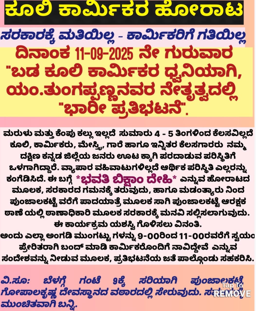 “ಸರಕಾರಕ್ಕೆ ಮತಿಯಿಲ್ಲ- ಕಾರ್ಮಿಕರಿಗೆ ಗತಿಯಿಲ್ಲ!!!! ” ಭವತಿ ಬಿಕ್ಷಾಂ ದೇಹಿ” ಎಂಬ ಸ್ಲೋಗನ್ ನಡಿ “ಬಡ ಕಾರ್ಮಿಕರ ಧ್ವನಿಯಾಗಿ” ಜಿ.ಪಂ.ಮಾಜಿ ಸದಸ್ಯ ಎಂ.ತುಂಗಪ್ಪ ಬಂಗೇರರವರ ನೇತ್ರತ್ವದಲ್ಲಿ ಸೆ.11 ರಂದು ಗುರುವಾರ ಪುಂಜಾಲಕಟ್ಟೆಯಲ್ಲಿ ಬೃಹತ್ ಪ್ರತಿಭಟನೆ ನಡೆಸುವುದಾಗಿ ಪ್ರಕಟನೆಯಲ್ಲಿ ತಿಳಿಸಿದ್ದಾರೆ.