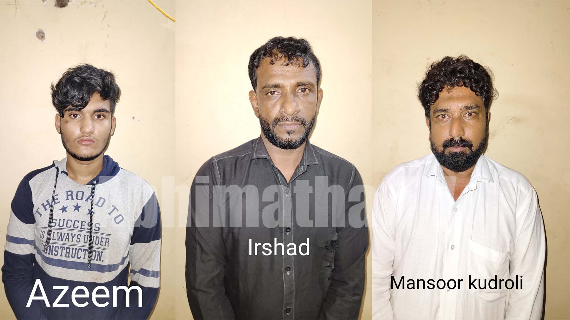 ಬಂಧಿತರನ್ನು ಉಳ್ಳಾಲ ಚೆಂಬುಗುಡ್ಡೆ ನಿವಾಸಿ ಇರ್ಷಾದ್, ಮಂಗಳೂರು ಕುದ್ರೋಳಿ ನಿವಾಸಿ ಮಹಮ್ಮದ್ ಮನ್ಸೂರ್ ಮತ್ತು ಮಂಗಳೂರು ಕಣ್ಣೂರು ನಿವಾಸಿ ಅಬ್ದುಲ್ ಅಝೀಮ್ ಎಂದು ಗುರುತಿಸಲಾಗಿದೆ. ಆರೋಪಿಗಳ ಮೇಲೆ ಅಗಸ್ಟ್ 14ರಂದು ಬಂಟ್ವಾಳ ಗ್ರಾಮಾಂತರ ಪೊಲೀಸ್ ಠಾಣಾ ವ್ಯಾಪ್ತಿಯ ತುಂಬೆ ಬಳಿ ಜಾನುವಾರು ಕಳ್ಳತನ ಮಾಡಿ ಬಳಿಕ ಅದನ್ನು ಅಲ್ಲೇ ಪರಿಸರದಲ್ಲಿ ಮಾಂಸ ಮಾಡಿದ ಪ್ರಕರಣ ದಾಖಲಾಗಿತ್ತು. ಈ ಪ್ರಕರಣದ ತನಿಖೆ ಮಾಡಿದ ಪೊಲೀಸರು ಮೂವರು ಆರೋಪಿಗಳನ್ನು ಅರೆಸ್ಟ್ ಮಾಡಿದ್ದಾರೆ. ಬಂಧಿತ ಮೂವರ ವಿಚಾರಣೆ ನಡೆಸಿದಾಗ ಉಪ್ಪಿನಂಗಡಿ ಸಮೀಪದ ಕಡಂಬು ಎಂಬಲ್ಲಿ ದನ ಕಳ್ಳತನ ಮಾಡಿ ಬಳಿಕ ಅಲ್ಲೆ ಅದನ್ನು ಕಡಿದು ಅದರ ಮಾಂಸವನ್ನು ಕೊಂಡೊಯ್ದ ಪ್ರಕರಣದಲ್ಲೂ ಇವರೇ ಆರೋಪಿಗಳು ಎಂದು ತಿಳಿದು ಬಂದಿದೆ. ಪೊಲೀಸರು ಆರೋಪಿಗಳ ವಿಚಾರಣೆ ಮುಂದುವರೆಸಿದ್ದಾರೆ.