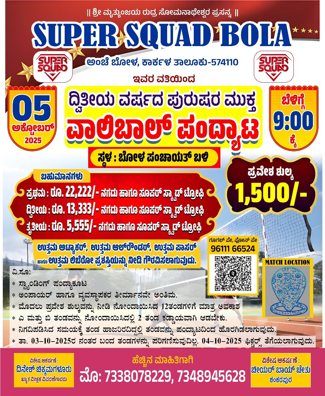 ಸೂಪರ್ ಸ್ವ್ಕಾಡ್ ಬೋಳ ಇವರ ವತಿಯಿಂದ ಅ. 5 ರಂದು ಬೆಳ್ಳಿಗೆ 9 ಗಂಟೆಗೆ ಬೋಳ ಪಂಚಾಯತ್ ಬಳಿ ದ್ವಿತೀಯ ವರ್ಷದ ಪುರುಷರ ಮುಕ್ತ ವಾಲಿಬಾಲ್ ಪಂದ್ಯಾಟ ನಡೆಯಲಿದೆ.