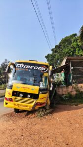 ಉಡುಪಿ ಕಡೆಯಿಂದ ಹಿರಿಯಡ್ಕ ಕಡೆ ಹೋಗುತ್ತಿದ್ದ ದುರ್ಗಾಂಬ ಕಂಪೆನಿಗೆ ಸೇರಿದ ಸ್ಲೀಪರ್ ಬಸ್ ಚಾಲಕನ ನಿಯಂತ್ರಣ ತಪ್ಪಿ ರಸ್ತೆ ಪಕ್ಕದ ಶಮಿತ್ ಹೋಟೆಲ್ ಆವರಣಕ್ಕೆ ಢಿಕ್ಕಿ ಹೊಡೆದಿದೆ. ಹೋಟೆಲ್ ಮಾಡಿಗೆ ವಾಲಿಕೊಂಡು ನಿಂತಿದ್ದು, ಬಸ್ನ ಮುಂಭಾಗದ ಚಕ್ರ ಚರಂಡಿಯೊಳಗೆ ಕುಸಿದಿದೆ. ಯಾವುದೇ ಪ್ರಾಣ ಹಾನಿ ಸಂಭವಿಸಿಲ್ಲ.