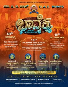 ಯುಎಇ ಬಂಟ್ಸ್ ನ 48 ನೇ ವರ್ಷದ “ಭಾವೈಕ್ಯ” ಬಂಟರ ಮಹಾಸಮಾಗಮವು ಡಿಸೆಂಬರ್ 14ರಂದು ನಗರದ ಶೇಖ್ ಝಯೀದ್ ರಸ್ತೆಯ ಮಿಲೆನಿಯಂ ಪ್ಲಾಜಾ ಹೋಟೆಲ್ ಡೌನ್ ಟೌನ್ ಹೋಟೆಲ್ (ಹಳೆಯ ಕ್ರೌನ್ ಪ್ಲಾಜಾ) ನ ಸಭಾಂಗಣದಲ್ಲಿ ಬೆಳಿಗ್ಗೆ 9 ಗಂಟೆಯಿಂದ ಸಂಜೆ 6 ಗಂಟೆಯ ವರೆಗೆ ಯುಎಇ ಬಂಟರ ವಿವಿಧ ಸಾಂಸ್ಕೃತಿಕ ಕಾರ್ಯಕ್ರಮ ಹಾಗೂ “ಬಂಟ ವಿಭೂಷಣ ಪ್ರಶಸ್ತಿ” ಪ್ರದಾನ ಕಾರ್ಯಕ್ರಮಗಳೊಂದಿಗೆ ಜರಗಲಿದೆ.