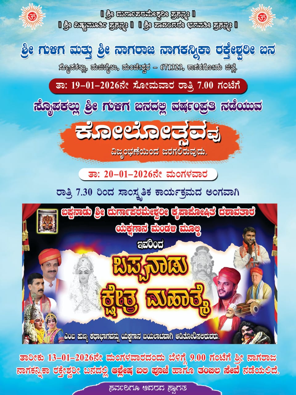 ಮಜಿಬೈಲುವಿನ ಶ್ರೀ ಗುಳಿಗ ಬನದಲ್ಲಿ ವರ್ಷಂಪ್ರತಿ ನಡೆಯುವ ಕೋಲೋತ್ಸವವು ಜನವರಿ 19ರಂದು ರಾತ್ರಿ 7 ಗಂಟೆಗೆ ವಿಜೃಂಭನೆಯಿಂದ ನಡೆಯಲಿದೆ. ಸಾಂಸ್ಕೃತಿಕ ಕಾರ್ಯಕ್ರಮದ ಅಂಗವಾಗಿ ದಿ. 20 ರಂದು ಬಪ್ಪನಾಡು ಶ್ರೀ ದುರ್ಗಾಪರಮೇಶ್ವರಿ ಕೃಪಾಪೋಷಿತ ದಶವತಾರ ಯಕ್ಷಗಾನ ಮಂಡಳಿ ಮುಲ್ಕಿ ಇವರಿಂದ ಬಪ್ಪನಾಡು ಕ್ಷೇತ್ರ ಮಹಾತ್ಮೆ ಎಂಬ ಪುಣ್ಯ ಕಥಾಭಾಗವನ್ನು ಯಕ್ಷಗಾನ ಬಯಲಾಟವಾಗಿ ಆಡಿತೋರಿಸಲಿದ್ದಾರೆ. ಹಾಗಾಗಿ ಈ ಎಲ್ಲಾ ಕೈಂಕರ್ಯಗಳಿಗೆ ಭಕ್ತಾಧಿಗಳು ಆಗಮಿಸಬೇಕಾಗಿ ವಿನಮ್ರವಾಗಿ ವಿನಂತಿಸಿಕೊಂಡಿದ್ದಾರೆ.