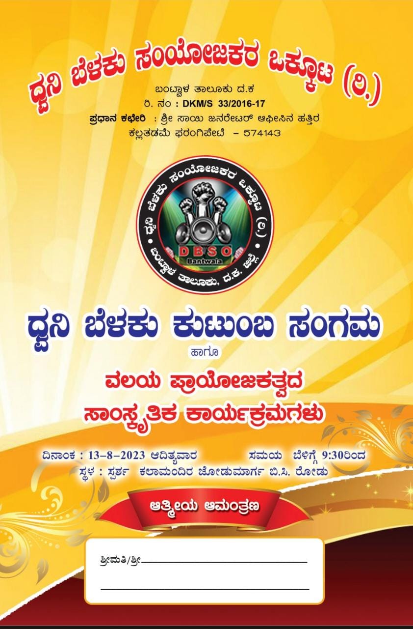 ಧ್ವನಿ ಬೆಳಕು ಸಂಯೋಜಕರ ಒಕ್ಕೂಟ (ರಿ) ವತಿಯಿಂದ ಧ್ವನಿ ಬೆಳಕು ಕುಟುಂಬ ಸಂಗಮ ಹಾಗೂ ವಿವಿಧ ವಲಯಯಗಳ ಪ್ರಾಯೋಜಕತ್ವದಲ್ಲಿ ಇದೇ ಬರುವ ಅಗಸ್ಟ್ 13 ರ ಆದಿತ್ಯವಾರದಂದು ಬಿ.ಸಿ.ರೋಡಿನ ಸ್ಪರ್ಶ ಕಲಾಮಂದಿರ ಜೋಡುಮಾರ್ಗದಲ್ಲಿ ಸಾಂಸ್ಕೃತಿಕ ಕಾರ್ಯಕ್ರಮಗಳು ಮೇಳೈಸಲಿದೆ.