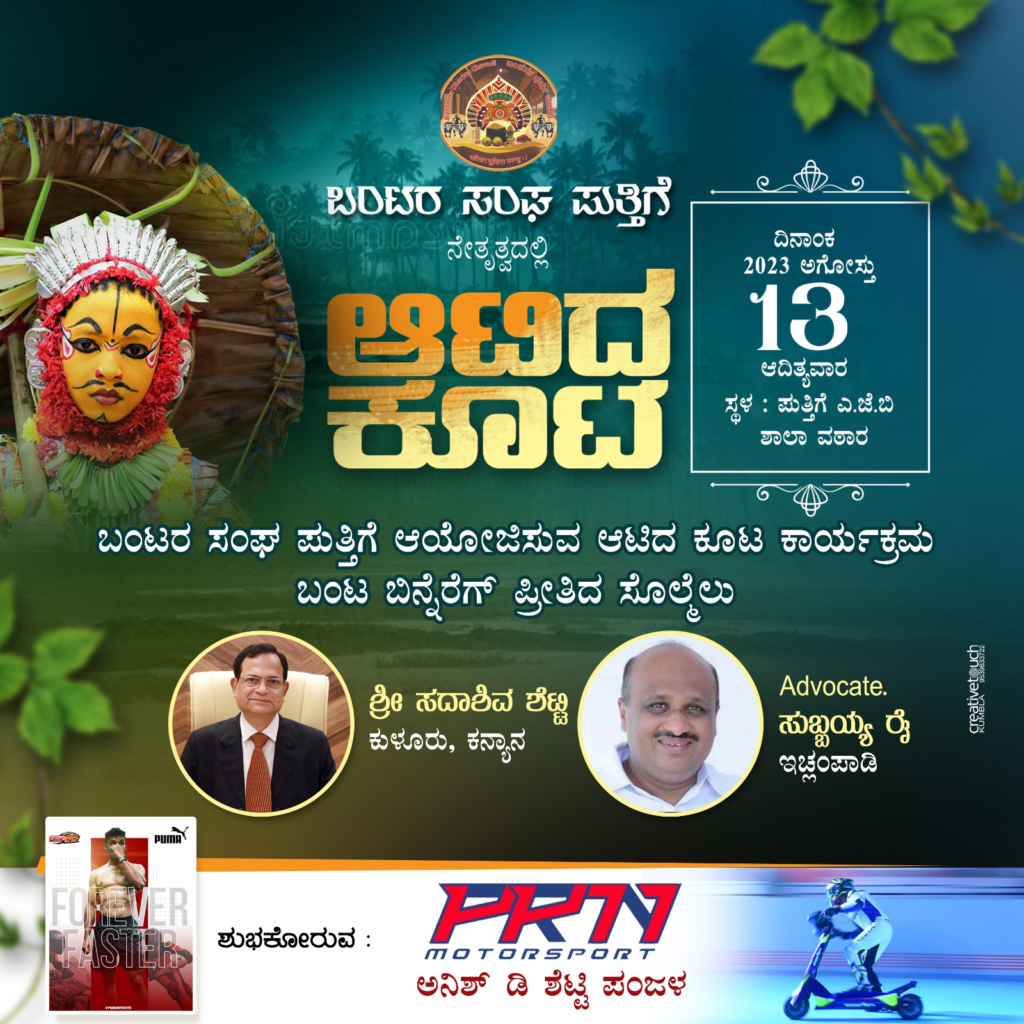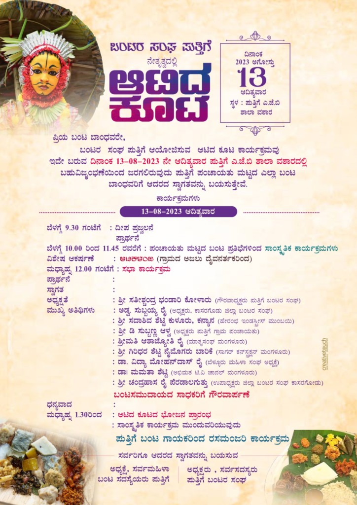 ಬಂಟರ ಸಂಘ ಪುತ್ತಿಗೆ ನೇತೃತ್ವದಲ್ಲಿ ಇದೇ ಬರುವ ಆ.13 ರಂದು ‘ಆಟಿದಕೂಟ ಕಾರ್ಯಕ್ರಮವು ಪುತ್ತಿಗೆ ಎಜೆಬಿ ಶಾಲಾ ವಠಾರದಲ್ಲಿ ಅದ್ದೂರಿಯಾಗಿ ನಡೆಯಲಿದೆ.