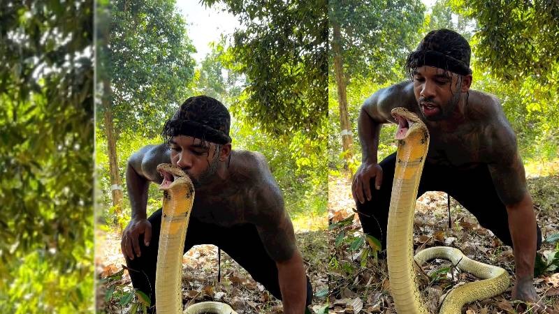 ದೃಶ್ಯದಲ್ಲಿ ಕಾಣಿಸುವ ವ್ಯಕ್ತಿ ಹೆಸರು ಹೋಲ್ಸ್ಟನ್. ಈ ವ್ಯಕ್ತಿ ವಿಷಕಾರಿ ಹಾವು ಕಾಳಿಂಗ ಸರ್ಪಕ್ಕೆ ಮುತ್ತು ಕೊಟ್ಟಿದ್ದಾನೆ. ಹಾವು ಹೆಡೆ ಬಿಚ್ಚಿ ತನ್ನ ಆವೇಷ ಹೊರಹಾಕುತ್ತಿದ್ರೂ ಲೆಕ್ಕಿಸದೇ ಹಿಂಬದಿಯಿ0ದ ಚುಂಬಿಸಿದ್ದಾನೆ.