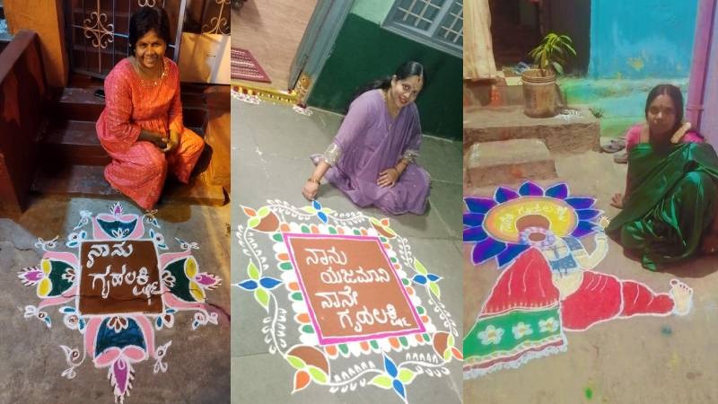 ಬೆಂಗಳೂರಿನ ದೊಡ್ಡಗುಬ್ಬಿಯಲ್ಲಿ ಮಹಿಳೆಯರು ಗೃಹಲಕ್ಷ್ಮಿ ಯೋಜನೆಯ ಹಿನ್ನೆಲೆ ರಂಗೋಲಿ ಬಿಡಿಸಿ ಸಂಭ್ರಮ ಆಚರಿಸಿದ್ದಾರೆ. ಸುಂದರ ರಂಗೋಲಿಯಲ್ಲಿ ನಾನೇ ಯಜಮಾನಿ, ನಾನೇ ಗೃಹಲಕ್ಷ್ಮಿ ಅಂತಾ ಬರೆದಿದ್ದು ತಮ್ಮ ಸಂತೋಷವನ್ನು ಹೊರ ಹಾಕುತ್ತಿದ್ದಾರೆ. ರಂಗೋಲಿಯ ಬಳಿ ಫೋಟೋ ತೆಗೆಸಿಕೊಂಡು ಸೋಷಿಯಲ್ ಮೀಡಿಯಾದಲ್ಲಿ ಹಂಚಿಕೊಂಡಿದ್ದಾರೆ.