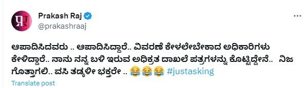 ಈ ಸಂಬಂಧ ಟ್ವೀಟ್ ಮಾಡಿರೋ ನಟ ಪ್ರಕಾಶ್ ರಾಜ್, ಆಪಾದಿಸಿದವರು ಆಪಾದನೆ ಮಾಡಿದ್ದಾರೆ. ವಿವರಣೆ ಕೇಳಲೇಬೇಕಾದ ಅಧಿಕಾರಿಗಳು ವಿವರಣೆ ಕೇಳಿದ್ದಾರೆ. ನನ್ನ ಬಳಿ ಇರೋ ಅಧಿಕೃತ ದಾಖಲೆ ಪತ್ರಗಳನ್ನು ಕೊಟ್ಟಿದ್ದೇನೆ. ನಿಜ ಗೊತ್ತಾಗಲಿ, ಸ್ವಲ್ಪ ಕಾಯಿರಿ ಎಂದು ತನ್ನನ್ನು ಟ್ರೋಲ್ ಮಾಡಿದವರಿಗೆ ಸ್ಪಷ್ಟನೆ ನೀಡಿದ್ದಾರೆ.