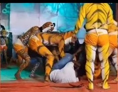 ಮೈಮೇಲೆ ಆವೇಶ ಬಂದು ವೇದಿಕೆಗೆ ಹಾಕಿದ್ದ ರೆಡ್ ಕಾರ್ಪೆಟ್ ನ್ನ ಬಾಯಲ್ಲಿ ಕಚ್ಚಿ ಹರಿದು ಹಾಕಿದ್ದಾರೆ. ಈ ಸಂದರ್ಭ ಹುಲಿವೇಷಧಾರಿಯನ್ನ ನಿಯಂತ್ರಣಕ್ಕೆ ತರುವಲ್ಲಿ ಸಹ ವೇಷಧಾರಿಗಳು ಹರಸಾಹಸ ಪಟ್ಟಿದ್ದು, ಈ ವೇಳೆ ಸಹವೇಷಧಾರಿಗೂ ಕಚ್ಚಿದ್ದಾರೆ ಎಂಬ ಮಾಹಿತಿ ಲಭ್ಯವಾಗಿದೆ.