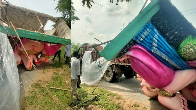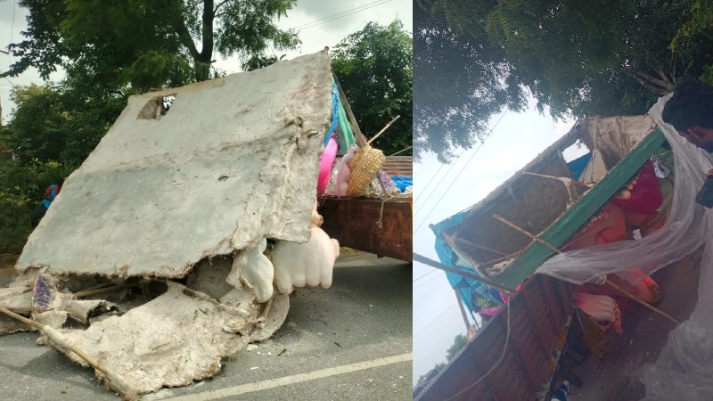 ಪ್ರತಿಷ್ಠಾಪನೆಗಾಗಿ ತೆಗೆದುಕೊಂಡು ಬರುತ್ತಿದ್ದ ಗಣೇಶ ಮೂರ್ತಿ ಪಲ್ಟಿಯಾದ ಘಟನೆ ತೆಲಂಗಾಣದ ನಂದಿನಿ ಗ್ರಾಮದ ಬಳಿ ನಡೆದಿದೆ.