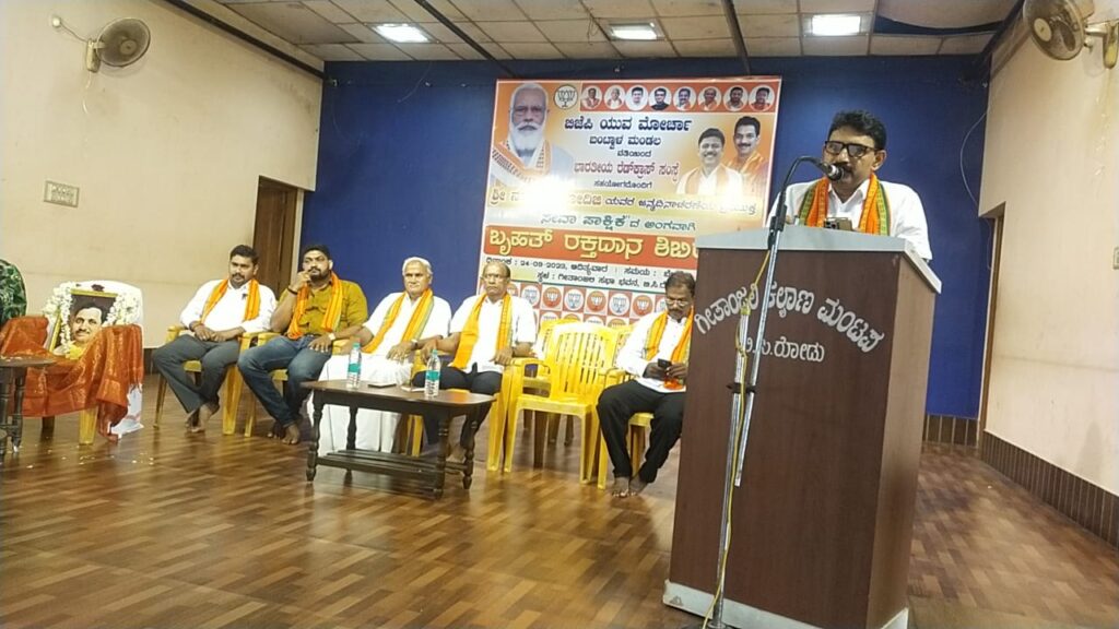 ಬಂಟ್ವಾಳ ಯುವ ಮೋರ್ಚಾ ಬಂಟ್ವಾಳ ಮಂಡಲ ವತಿಯಿಂದ ಭಾರತೀಯ ರೆಡ್ ಕ್ರಾಸ್ ಸಂಸ್ಥೆ ಸಹಯೋಗದೊಂದಿಗೆ ಪ್ರಧಾನಿ ನರೇಂದ್ರ ಮೋದಿಯವರ ಜನ್ಮ ದಿನಾಚರಣೆ ಪ್ರಯುಕ್ತ ಸೇವಾ ಪಾಕ್ಷಿಕದ ಅಂಗವಾಗಿ ಬೃಹತ್ ರಕ್ತದಾನ ಶಿಬಿರ ಮತ್ತು ಪ್ರಧಾನಿ ಶ್ರೀ ನರೇಂದ್ರ ಮೋದಿಯವರ ಮನ್ ಕಿ ಬಾತ್ ವೀಕ್ಷಣೆ ಬಿಸಿರೋಡಿನ ಗೀತಾಂಜಲಿ ಸಭಾಂಗಣದಲ್ಲಿ ನಡೆಯಿತು.