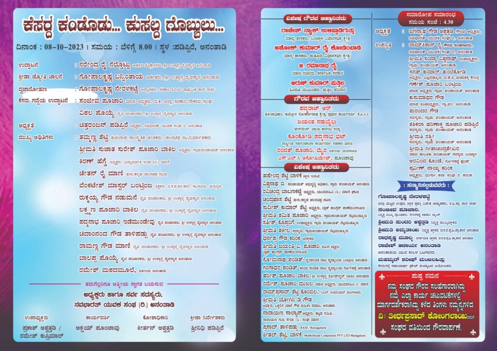 ನವ ಭಾರತ್ ಯುವಕ ಸಂಘ (ರಿ) ಅನಂತಾಡಿ ಇದರ ವತಿಯಿಂದ “ಕೆಸರ್ದ ಕಂಡೋಡು ಕುಸಲ್ದ ಗೊಬ್ಬುಲು” ಕ್ರೀಡಾಕೂಟವು ಅನಂತಾಡಿ ಗ್ರಾಮದ ಪಡಿಪ್ಪಿರೆ ಎಂಬಲ್ಲಿ ಅ.8 ರ ಆದಿತ್ಯವಾರದ0ದು ಸಂಘದ ಅಧ್ಯಕ್ಷರಾದ ಚಿತ್ತರಂಜನ್ ಪಡಿಪ್ಪಿರೆ ಇವರ ಅಧ್ಯಕ್ಷತೆಯಲ್ಲಿ ಜರಗಲಿರುವುದು.