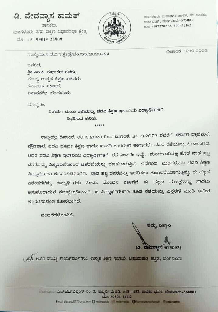ಮಂಗಳೂರಿನಲ್ಲಿ ಈಗಾಗಲೇ ಶಾಲಾ ಮಕ್ಕಳಿಗೆ ದಸರಾ ರಜೆ ನೀಡಲಾಗಿದ್ದು ಪದವಿ ವಿದ್ಯಾರ್ಥಿಗಳಿಗೆ ರಜೆ ಘೋಷಿಸದಿರುವುದು ಹಬ್ಬದ ಸಂಭ್ರಮ ಸವಿಯಲು ಅಡ್ಡಿಯಾಗಿದೆ. ನಾಡಿನ ಪ್ರಮುಖ ಹಬ್ಬ ದಸರಾಗೆ ಪೂರಕವಾಗುವಂತೆ ಪದವಿ ವಿದ್ಯಾರ್ಥಿಗಳಿಗೂ ರಜೆ ನೀಡುವ ಬಗ್ಗೆ ಹಲವಾರು ಪೋಷಕರು ಈಗಾಗಲೇ ಮನವಿ ಮಾಡುತ್ತಿದ್ದು ಸರಕಾರ ಈ ಬಗ್ಗೆ ಗಮನ ಹರಿಸಬೇಕು ಎಂದು ಶಾಸಕ ವೇದವ್ಯಾಸ್ ಕಾಮತ್ ಅವರು ಆಗ್ರಹಿಸಿದರು.