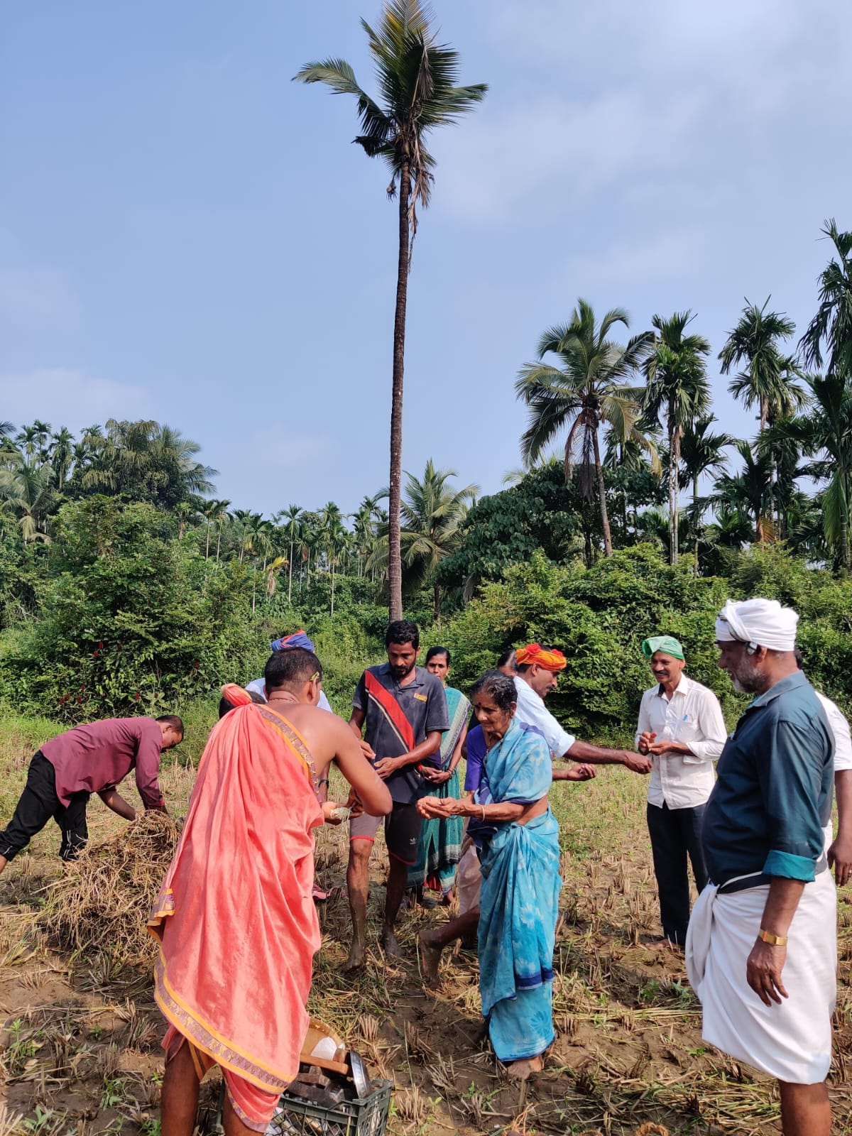 ಆರಂಭದಲ್ಲಿ ತೆನೆಗೆ ಪೂಜೆ ಸಲ್ಲಿಸಿ ಬಳಿಕ ಬತ್ತವನ್ನು ಕೊಯ್ಯಲಾಯಿತು. ಕೊಯ್ದ ತೆನೆಯನ್ನು ತೆರೆದ ವಾಹನದ ಮೂಲಕ ದೇವಾಲಯಕ್ಕೆ ತಂದು, ದೇವರ ಮುಂದೆ ತೆನೆಯನ್ನು ಇರಿಸಿ ಪೂಜೆ ಸಲ್ಲಿಸಿ ಅಬಳಿಕ ತೆನೆಯನ್ನು ಕಟ್ಟಿದರು.