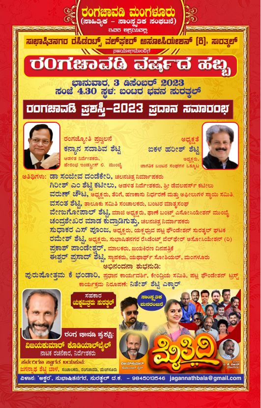 ಮಂಗಳೂರು:ರoಗಚಾವಡಿ ಮಂಗಳೂರು ಇದರ ಆಶ್ರಯದಲ್ಲಿ ಸುಭಾಷಿತನಗರ ರೆಸಿಡೆಂಟ್ಸ್ ವೆಲ್ಫೇರ್ ಅಸೋಸಿಯೇಶನ್(ರಿ.) ಸುರತ್ಕಲ್ ಸಹಯೋಗದೊಂದಿಗೆ ರಂಗಚಾವಡಿ ವರ್ಷದ ಹಬ್ಬ ನಡೆಯಲಿದೆ.